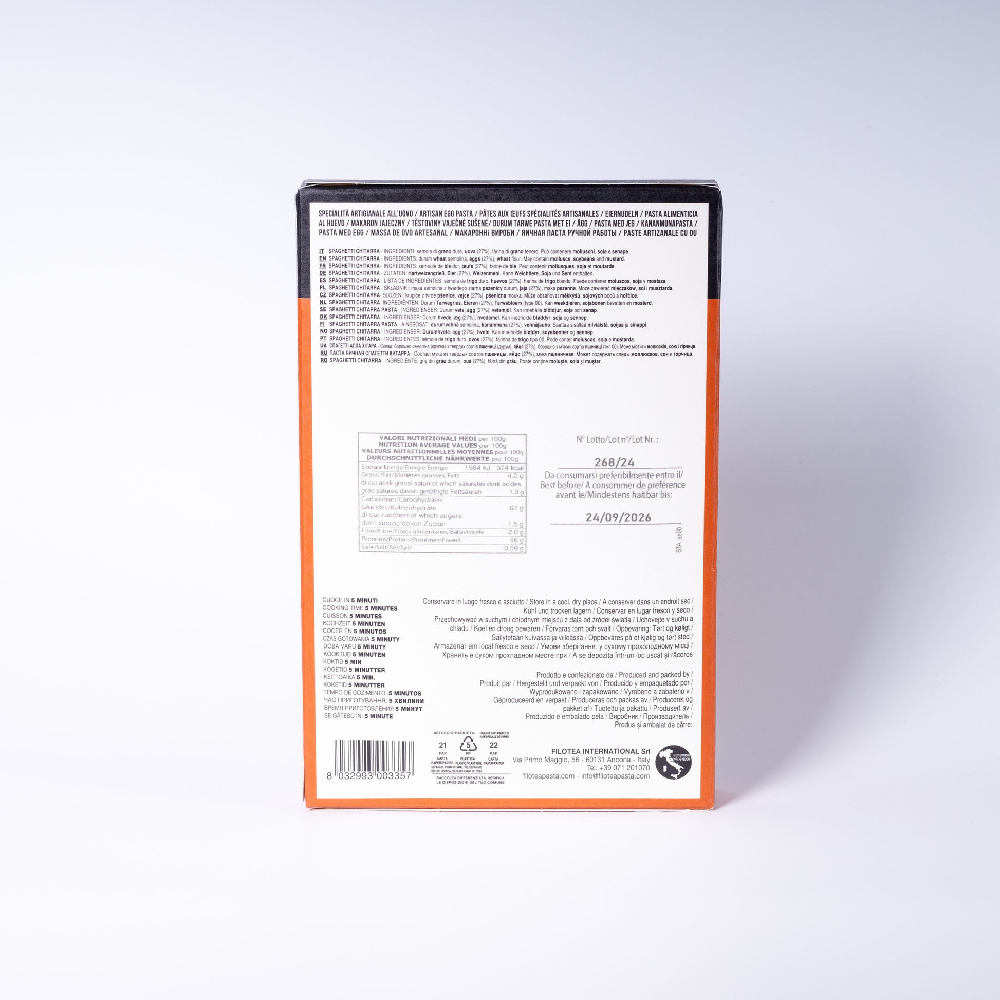 Die Spaghetti alla Chitarra sind quadratische Nudeln, ein wenig dicker als Tagliolini. Sie passen besonders gut zu Fleisch- oder Fischsaucen. Die Kochzeit beträgt nur 3 Minuten.