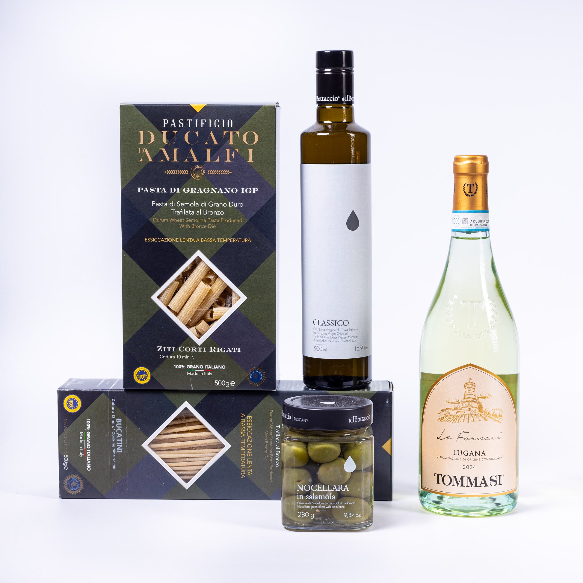 Mit Sapori d’Italia holen Sie sich die wichtigsten Grundlagen der italienischen Küche direkt nach Hause. Dieses sorgfältig zusammengestellte Essentials-Bundle vereint hochwertige Produkte aus renommierten Regionen Italiens – vom eleganten Weißwein über feinstes Olivenöl und aromatische Tafeloliven bis hin zu meisterhaft hergestellter Pasta aus Gragnano. Alles, was Sie benötigen, um jederzeit italienische Genussmomente zu kreieren, ist in diesem Set enthalten.